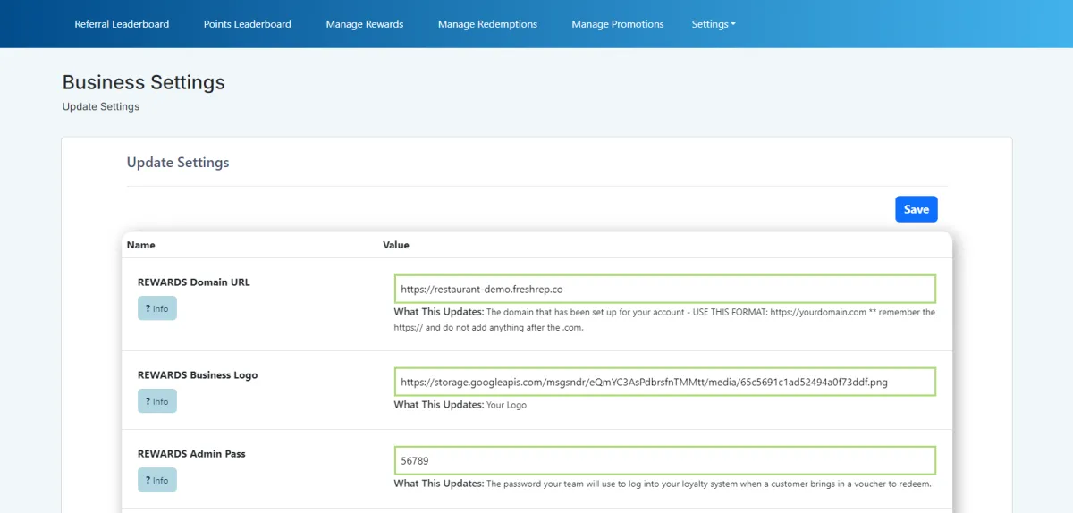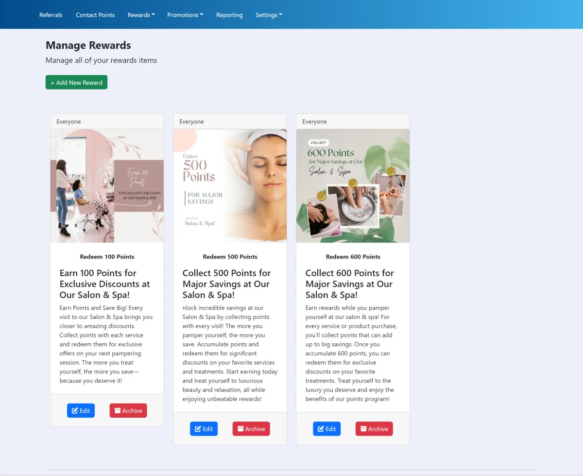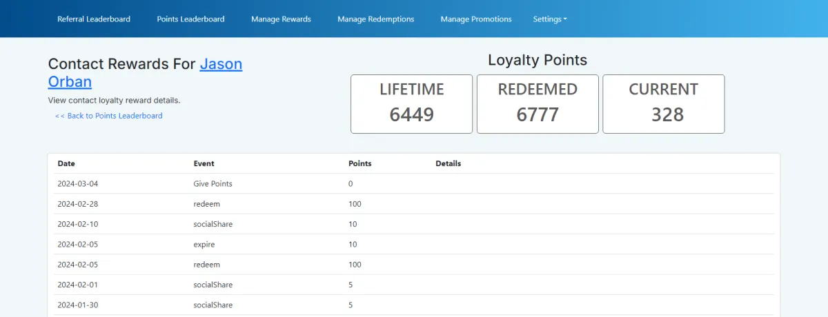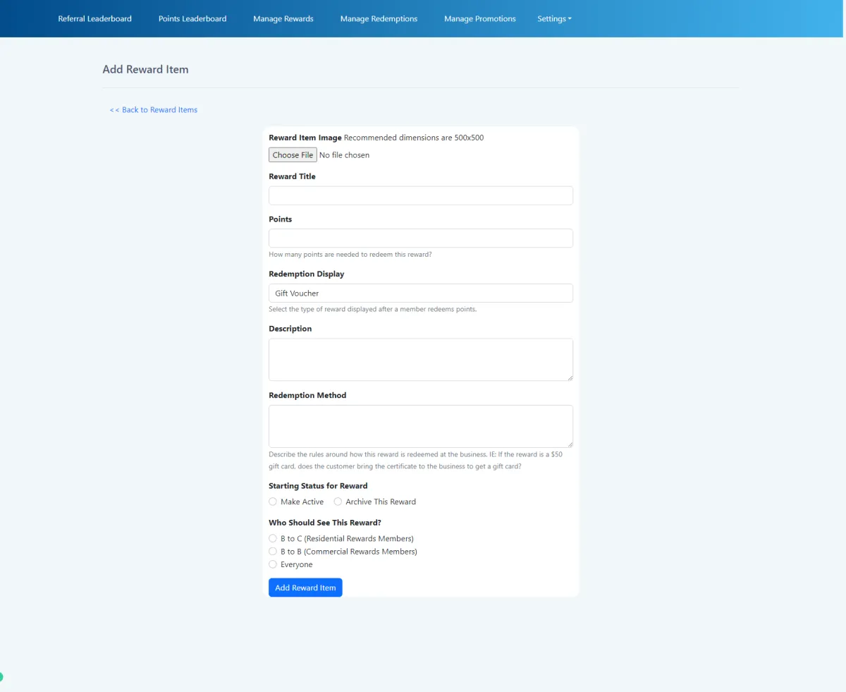 Add rewards, set points values for redemptions, and when your customer has enough points saved up they can redeem these rewards, and print off a voucher they can bring in to receive their item.